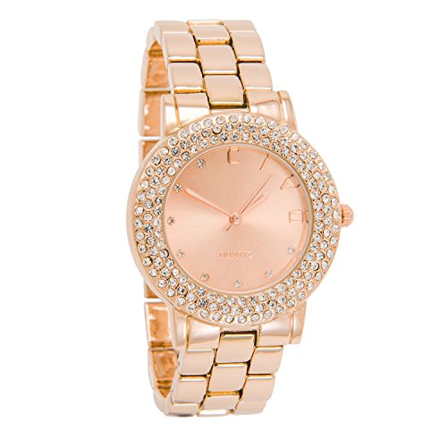 - SPECIAL DESIGN WATCH FOR DAILY USE: 5M daily Waterproof; IP rose golden plating watch case which will never fade; hundreds of bright artificial crystals embedded in watch face; high quality stainless steel watch band; key scratch resistant watch face made of high hardness glass; case diameter:36mm; Band Width:17mm; Band Length: Women's Standard