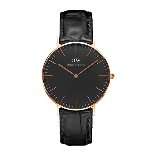 This unisex Daniel Wellington Classic Black Reading Watch 36mm watch has a PVD rose plating case and is powered by a quartz movement. It is fastened with a black leather strap and has a black dial.